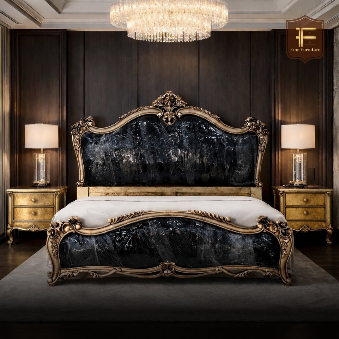 This bed exudes luxury and elegance with its grandiose design. The large, curved headboard features intricate patterns and a glossy black Velvet, making it a striking focal point. The bed frame is adorned with a gold-colored finish and elaborate detailing, adding to its opulent appeal. Flanking the bed are two matching nightstands with a golden finish and black tabletops, perfectly complementing the bed’s aesthetic. This piece is ideal for those looking to furnish their bedroom in a lavish, sophisticated style.