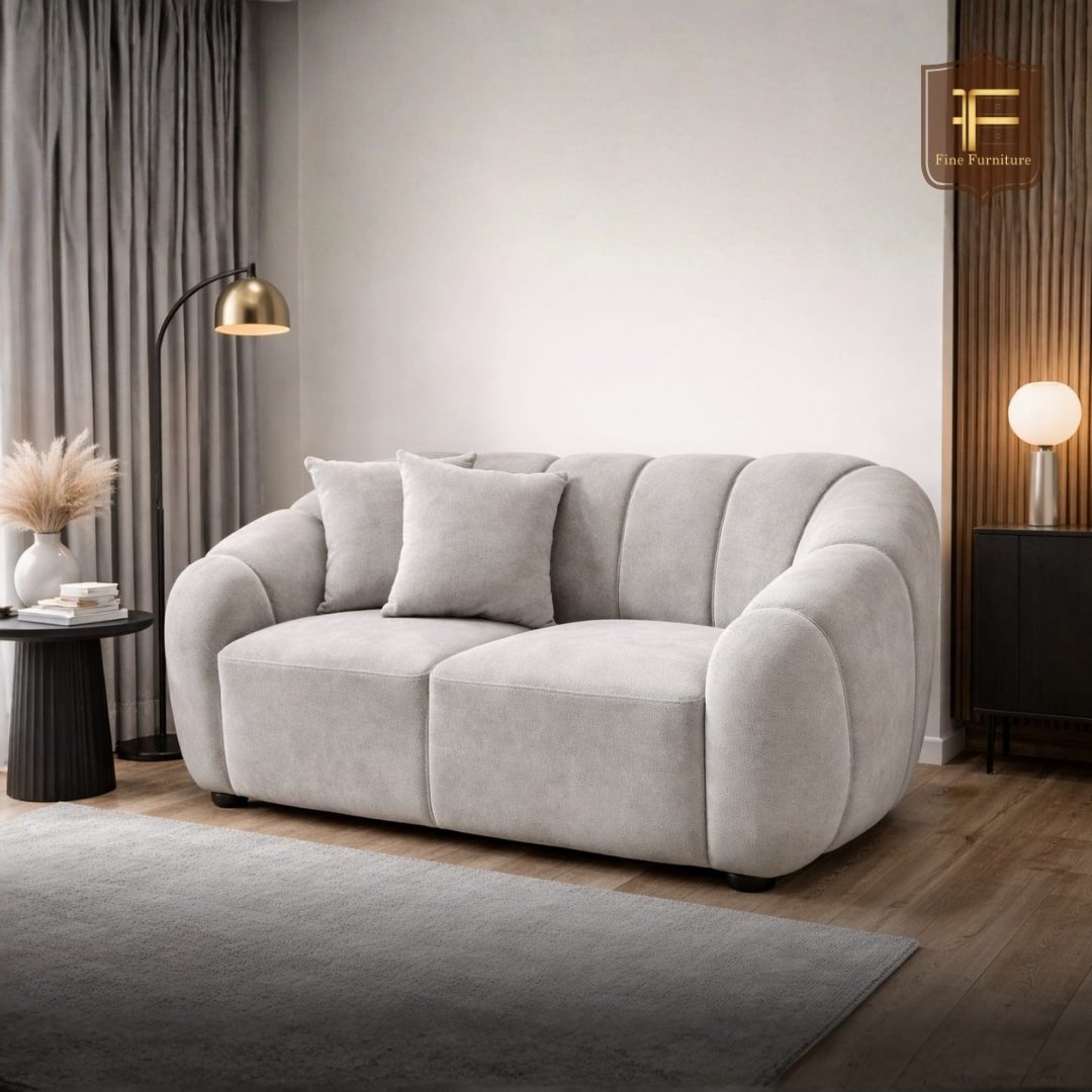Elevate your living space with this cozy 2-seater grey sofa featuring elegant. The sofa comes with two decorative cushions, adding a touch of sophistication and comfort. Perfect for contemporary home decor, this piece is designed to blend seamlessly with any interior.